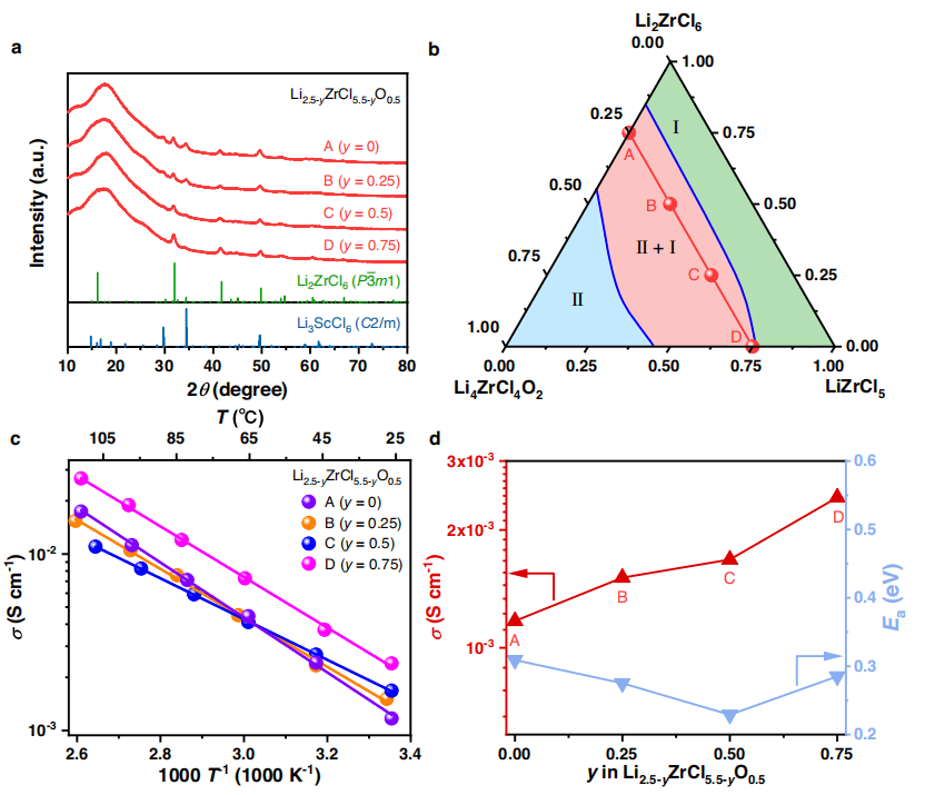 不久前,中國科學技術大學馬騁教授課題組開發了一種氧氯化物固態電解質Li1.75ZrCl4.75O0.5,很好的滿足了離子電導率、可變形性和成本競爭力這三個條件。Li1.75ZrCl4.75O0.5在室溫下表現出高達2.42mS/cm的離子電導率,超過了大多數鹵化物固態電解質,即便和硫化物固態電解質相比也并不遜色。與此同時,該材料還具有良好的可變形性,在300 MPa冷壓之后的相對密度高達94.2%,超過了目前常見的以良好可變形性著稱的Li10GeP2S12、Li6PS5Cl、Li2ZrCl6、Li3InCl6等固態電解質。除此之外,由于作為原料的LiCl、LiOH·H2O、ZrCl4價格低廉,Li1.75ZrCl4.75O0.5的原材料成本僅$11.60/kg。而如果使用更為廉價的ZrOCl2·8H2O、LiCl、ZrCl4合成,Li1.75ZrCl4.75O0.5的原材料成本還可以進一步降低。