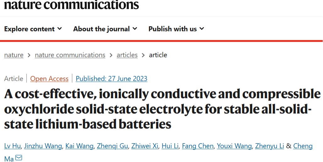 該成果6月27日以《A cost-effective, ionically conductive and compressible oxychloride solid-state electrolyte for stable all-solid-state lithium-based batteries》為題發表在國際學術期刊《Nature Communications》上。