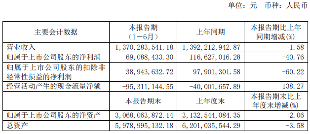 報告期內,公司 2023 年上半年度實現營業收入為 59,497.76 萬元,同比增長 28.81%;歸屬于上市公司股東的凈利潤 7,942.24萬元,同比減少 3.45%,歸屬于上市公司股東扣除非經常性損益的凈利潤為 7,712.75 萬元,同比增長 1.33%。