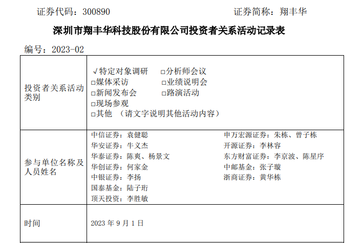 深圳市翔豐華科技股份有限公司投資者關系活動記錄表