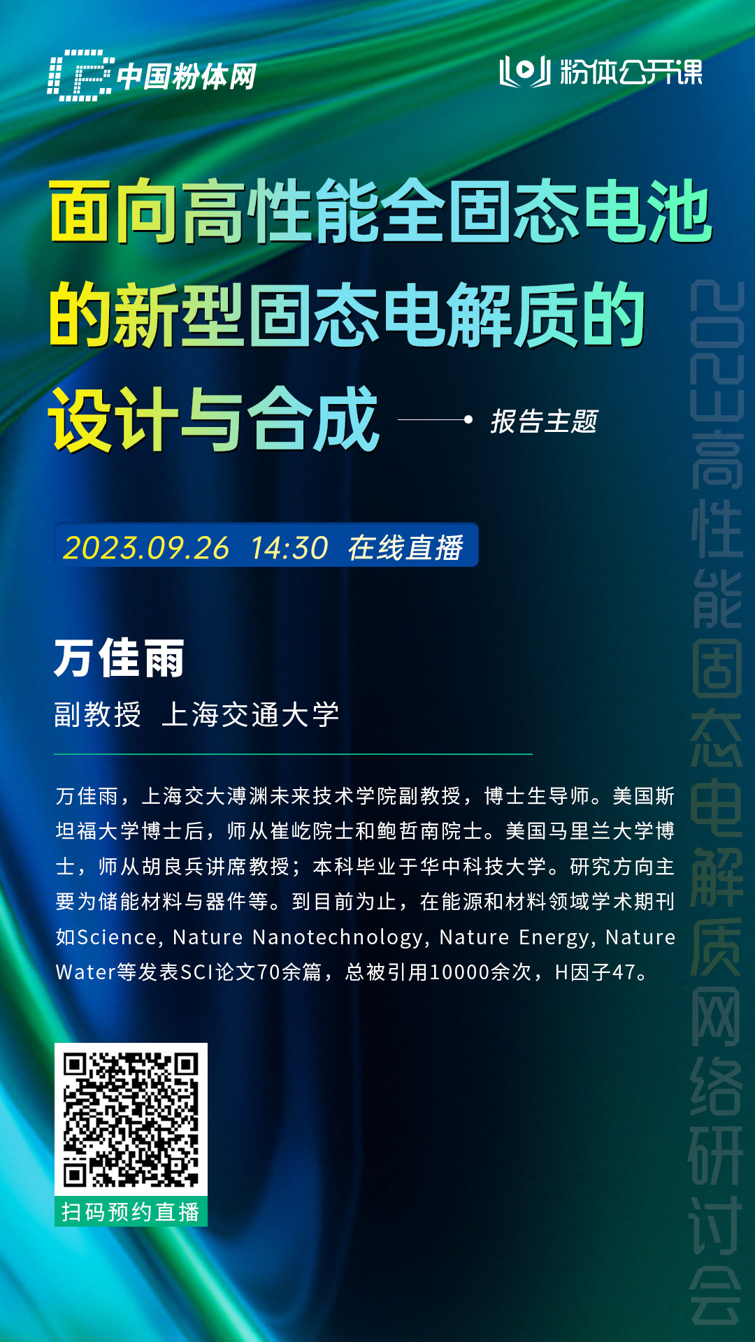 粉體公開課平臺將于9月26號下午舉辦“2023高性能固態電解質網絡研討會”,此次研討會將著重探討目前固態電解質的研究現狀和進展。歡迎固態電池相關企業研發人員和高校師生共同探討學習。