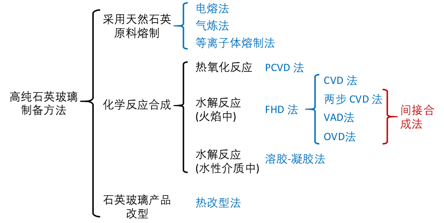 工業中常見的直接合成法為化學氣相沉積法(CVD),間接合成法包括在CVD法基礎上改良的兩步CVD法、氣相軸向沉積法(VAD)及管外氣相沉積法(OVD)等。