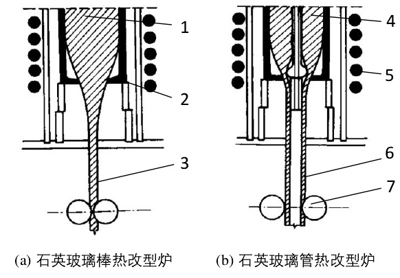 (圖中部件:1-石英玻璃母棒;2-發熱體;3-石英玻璃棒;4-石英玻璃母管;5-感應線圈;6-石英玻璃管;7-牽引器)
