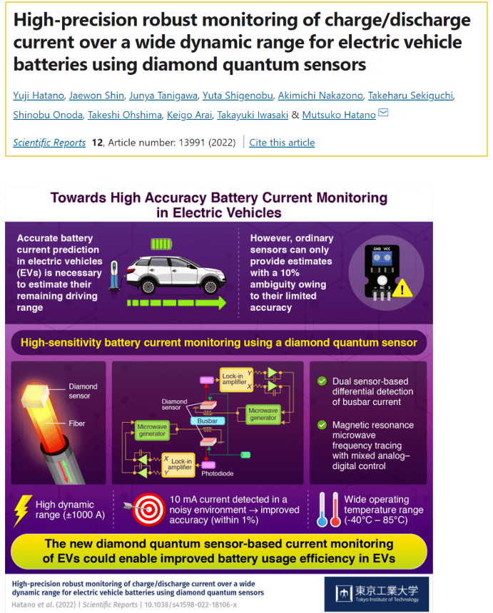 東京工業大學研究人員提出了一個解決電動汽車低效的方案。在《科學報告》(Scientific Reports)上發表的研究中,該團隊報告了一種基于金剛石量子傳感器的檢測技術,該技術可以在測量電動汽車大電流時,以1%的精確度估計電池電量。