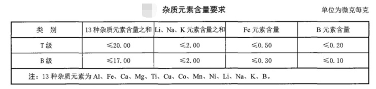 T級(jí)石英玻璃管的鋁、鐵、鈣、鎂、鈦、銅、鈷、錳、鎳、鋰、鈉、鉀、硼十三種雜質(zhì)元素的總含量應(yīng)不大于30.00x10-6,其中:鐵含量應(yīng)不大于1.50x10-6,鈦含量應(yīng)不大于3.00x10-6,銅含量應(yīng)不大于0.80x10-6,硼含量應(yīng)不大于0.20x10-6,鋰、鈉、鉀總含量應(yīng)不大于5.00x10-6。