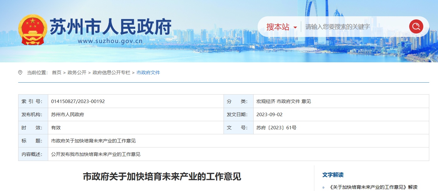 中國粉體網訊 近日,蘇州市人民政府印發《關于加快培育未來產業的工作意見》(以下簡稱《意見》),提出到2030年,重點突破一批填補國內空白的關鍵核心技術,未來產業與戰略性新興產業、優勢主導產業形成有效銜接,全市未來產業總產值突破5000億元。到2035年,形成1到2個領跑全國的千億級未來產業創新集群,全市未來產業總產值突破10000億元。