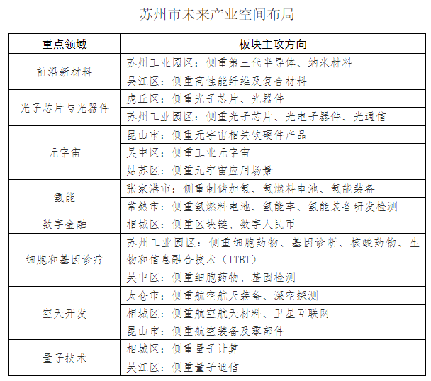 《意見》指出,要結合蘇州市電子信息、裝備制造、生物醫藥、先進材料四大主導產業的規模優勢,依托光子、集成電路、人工智能、新能源、創新藥物、納米新材料等戰略性新興產業的發展優勢,重點發展前沿新材料、光子芯片與光器件、元宇宙、氫能、數字金融、細胞和基因診療、空天開發、量子技術等未來產業。