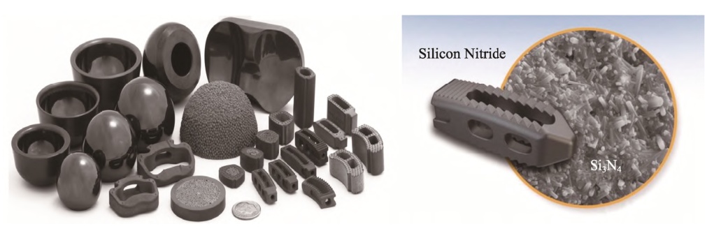 氮化硅陶瓷除具有較高的強(qiáng)度和韌性以外,其優(yōu)異的化學(xué)穩(wěn)定性和生物相容性使其非常適合作為生物陶瓷。氮化硅陶瓷材料較傳統(tǒng)的氧化鋯生物陶瓷具有更加優(yōu)異的抗感染力以及骨長上和骨長入能力。與此同時(shí),氮化硅陶瓷材料不僅具有高硬度、高耐磨性的表面特性,還具有多孔性特征,該特性能夠支持同位格的骨骼內(nèi)部生長,有利于支撐骨架和耐久生物固定。適合于假體、膝關(guān)節(jié)和外科整形手術(shù)移植部件等生物領(lǐng)域的應(yīng)用。