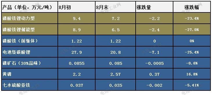 8月份電池級碳酸鋰價格繼續回落,月跌幅達25.4%,受此影響磷酸鐵鋰正極材料價格也出現大幅下跌。電池級碳酸鋰價格由月初的9.4萬元/噸下跌至月末的7.2萬元/噸。