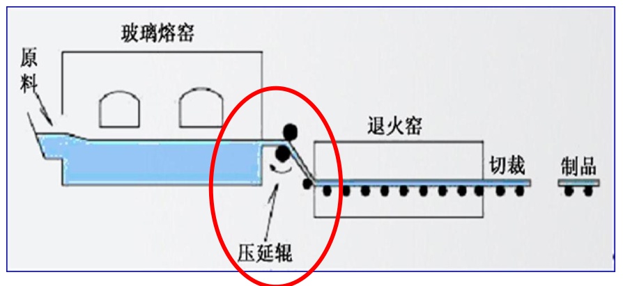 壓延法是利用壓延機(jī)將熔窯中出來的玻璃液成型,再經(jīng)退火、切裁而得壓延原片玻璃,由于超白壓延玻璃生產(chǎn)線投入資金大,制造難度大,對(duì)原料精度要求高,因此制備成本較高。