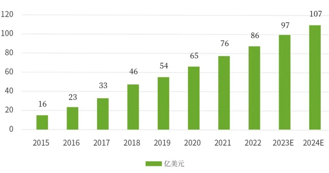 2015-2024年全球藍寶石行業(yè)市場規(guī)模統(tǒng)計情況及預測,數(shù)據(jù)來源:LEDinside