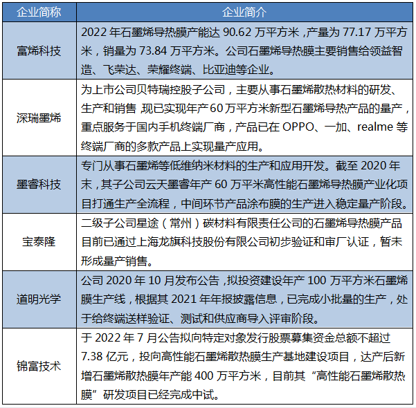 目前,富烯科技、深瑞墨烯、墨睿科技已實現一定規模的銷售。此外,A股上市公司道明光學、錦富技術、寶泰隆等對石墨烯導熱膜領域進行了布局。
