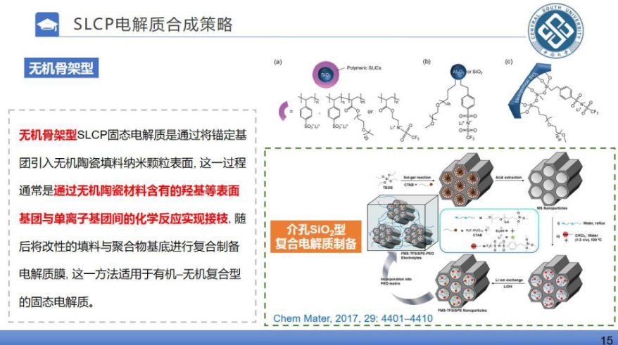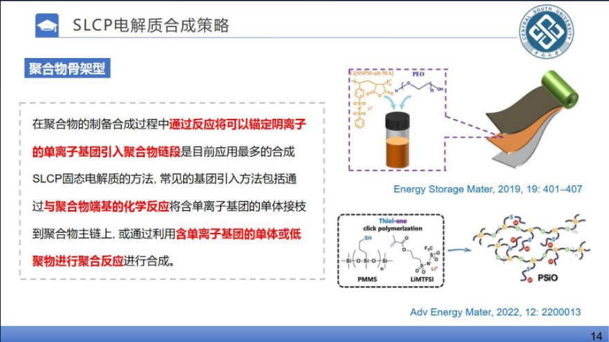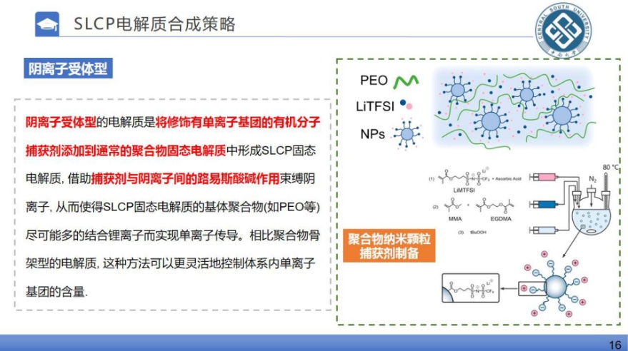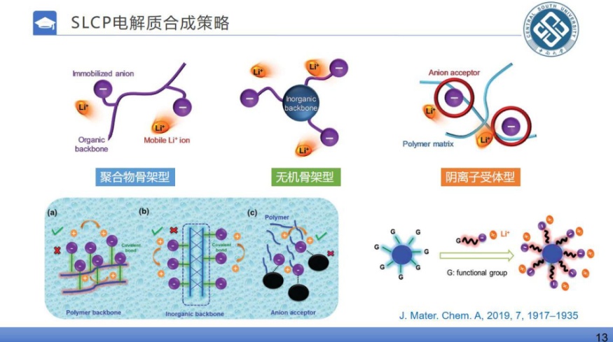 首先劉洪濤教授總結了近年來SLCP固態電解質的設計策略,包含聚合物骨架型、無機骨架型和陰離子受體型。