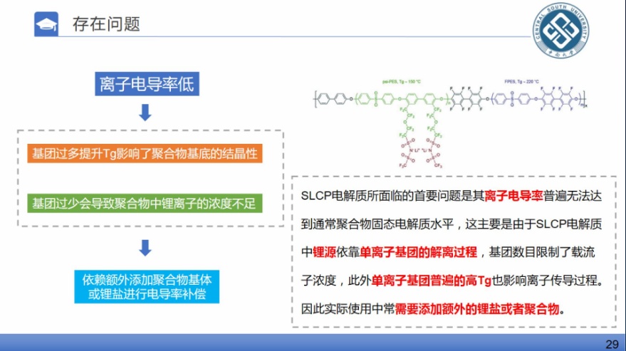 與常見的雙離子導電聚合物電解質不同,單鋰離子導電聚合物(SLCP)電解質是通過引入特殊基團,將陰離子束縛固定以限制其遷移,從而實現由鋰離子遷移為主的導電機制,其鋰離子遷移數通常高于0.5,理論上可以達到1。高的鋰離子遷移數會大幅度降低濃差極化,抑制鋰枝晶的生長,提升固態電池的充放電循環性能。SLCP固態電解質既可以解決界面問題又可以解決鋰枝晶問題。