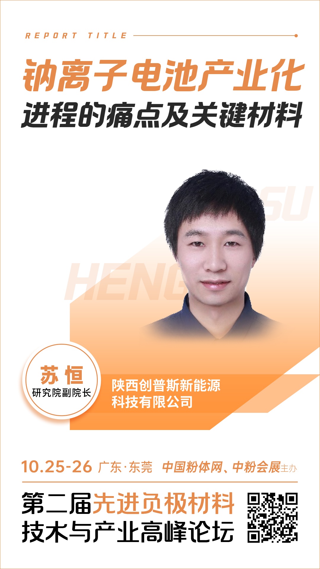 針對各類負極材料的產業化技術與國內外市場狀況,中國粉體網將于10月25-26日在東莞舉辦“第二屆先進負極材料技術與產業高峰論壇“。我們有幸邀請到陜西創普斯新能源科技有限公司鈉電研究院的蘇恒副院長,屆時他將帶來題為《鈉離子電池產業化進程的痛點及關鍵材料》的報告。