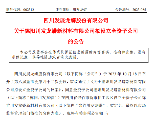 中國粉體網(wǎng)訊  10月19日,川發(fā)龍蟒發(fā)布公告,公司于2023年10月18日召開了第六屆董事會第四十二次會議,審議通過了《關(guān)于德陽川發(fā)龍蟒新材料有限公司擬設(shè)立全資子公司的議案》,同意全資子公司德陽川發(fā)龍蟒新材料有限公司(簡稱“德陽川發(fā)龍蟒”)在四川省綿竹市新市化工園區(qū)設(shè)立全資子公司綿竹川發(fā)龍蟒新材料有限公司(簡稱“綿竹川發(fā)龍蟒”)。并以綿竹川發(fā)龍蟒為主體,投資建設(shè)年產(chǎn)10萬噸磷酸鐵鋰及配套生產(chǎn)裝置。