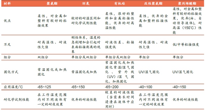 近幾年,輕質金屬、復合材料等在汽車上普遍應用促使車用膠粘劑的需求不斷增加。目前汽車用膠基材包含聚氨酯、環氧樹脂、有機硅、丙烯酸等,其中聚氨酯、環氧膠、有機硅是主流基材。
