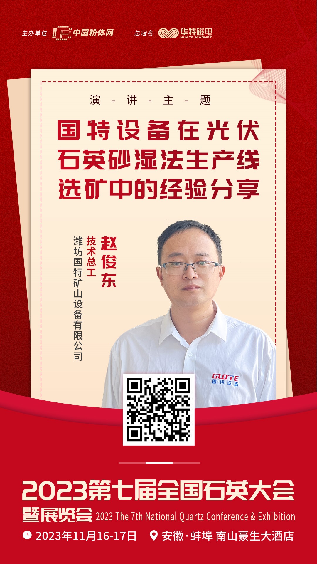 2023年11月16-17日,中國粉體網將于安徽·蚌埠南山豪生大酒店舉辦“2023(第七屆)全國石英大會暨展覽會”。來自濰坊國特礦山設備有限公司的技術總工趙俊東將作《國特設備在光伏石英砂濕法生產線選礦中的經驗分享》報告。