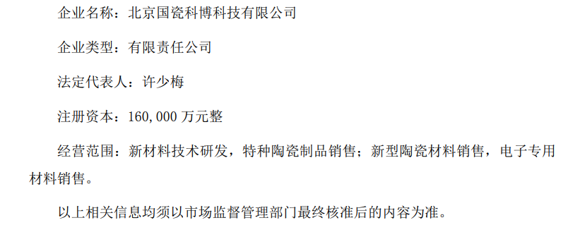 中國粉體網(wǎng)訊 近日,國瓷材料發(fā)布公告,國瓷材料擬使用自有或自籌資金160,000萬元人民幣在北京市投資設立全資子公司北京國瓷科博科技有限公司。