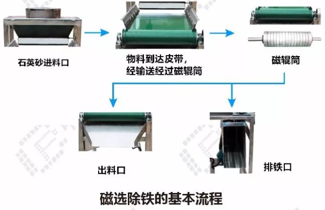 石英砂中含鐵的雜質礦物具有可磁化的特性,利用外界磁場可以將石英砂中的可磁化礦物與非磁性礦物分離,進而達到除去鐵質的目的。