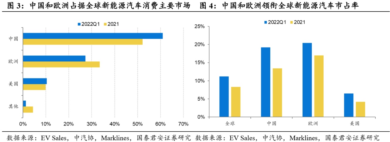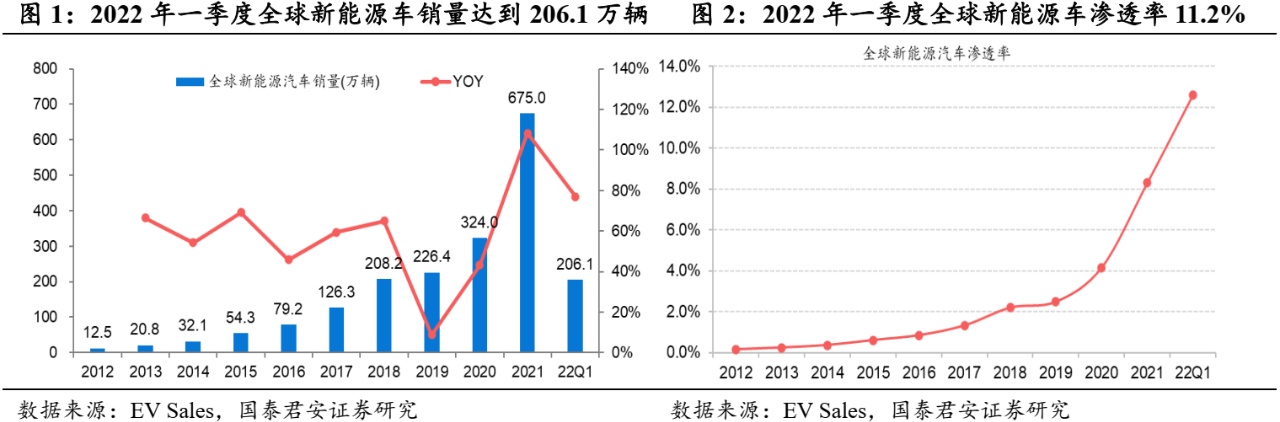 海內外共振,全球汽車電動化趨勢明顯。根據EV Sales數據統計,2012-2021年全球新能源汽車銷量從12.5萬輛增長至675萬輛,CAGR 55.7%。同時,全球新能源汽車滲透率穩步提升,2021年全球滲透率達到8.3%,較2020年提升4.1個pct。2022年第一季度,全球新能源汽車銷量達到206.1萬輛,同比增長77%,滲透率達到11.2%。其中,中國整體新能源汽車銷量達到125.7萬輛,同比增長142.7%,滲透率達到19.2%;歐洲整體新能源汽車銷量達到56.2萬輛,同比增長23.7%,滲透率達到20.4%;美國新能源乘用車銷量達到21.6萬輛,同比增長71.8%,滲透率達到6.5%。