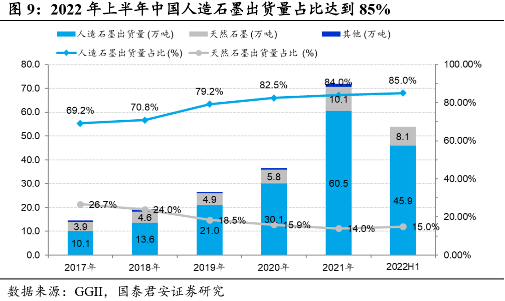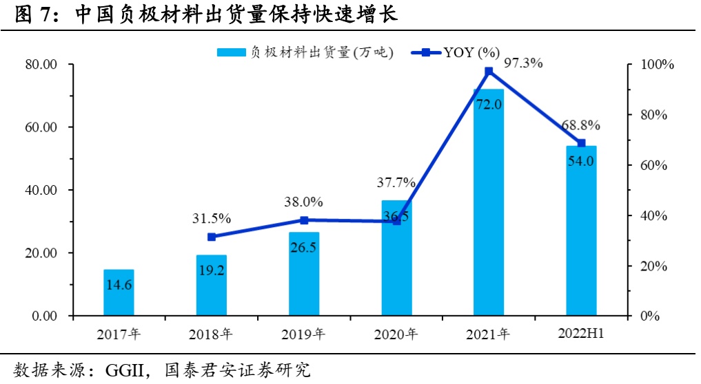 負極材料出貨量保持快速提升,中國市占率領銜全球。根據GGII數據,2017-2021年中國負極材料出貨量CAGR達49.0%;2021年我國負極材料出貨量達到72.0萬噸,同比增長97.3%,占全球總出貨量的比例由2020年的77%提高到2021年的86%。2022年上半年我國鋰電負極材料出貨量54.0萬噸,同比增長68.8%。