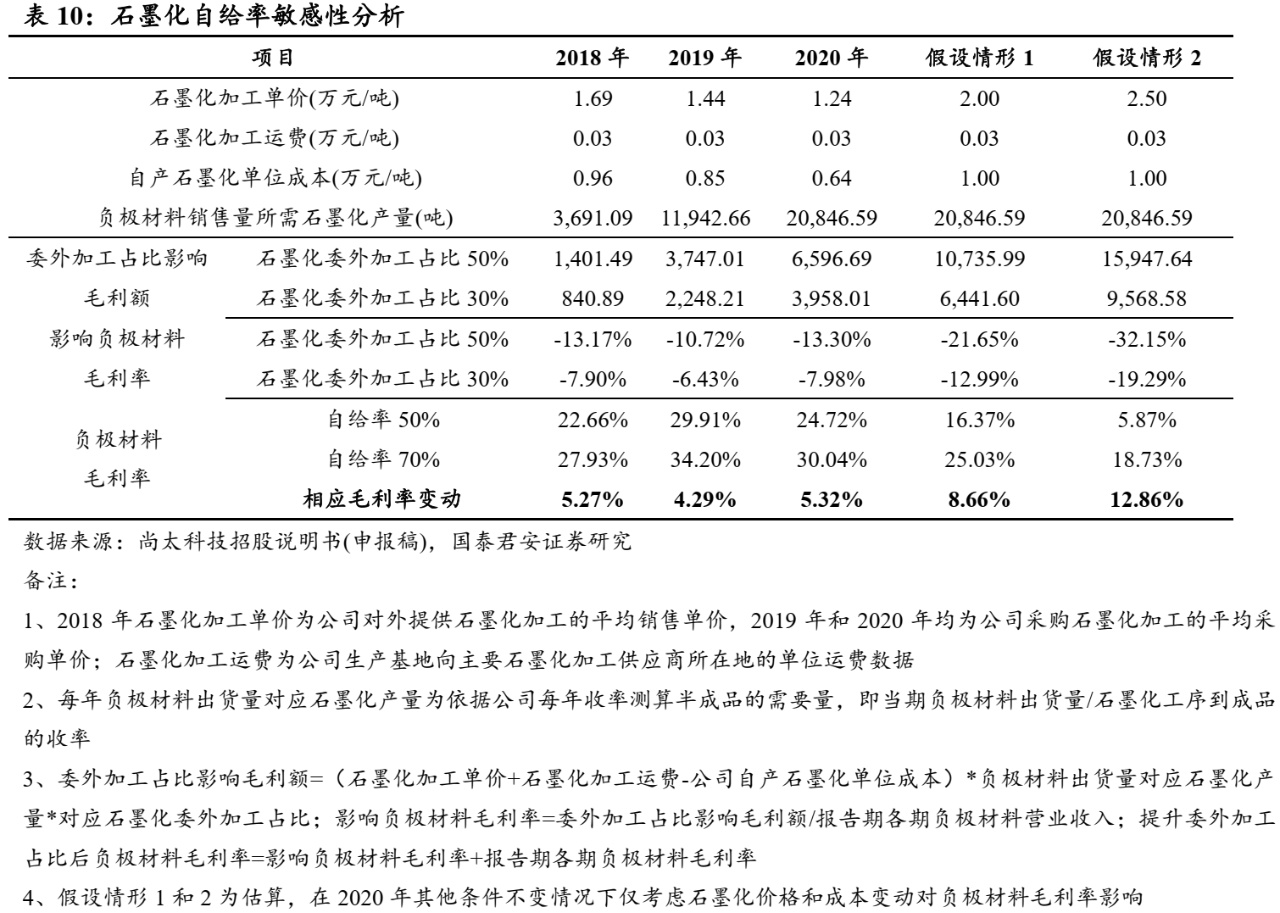 石墨一體化推動負極企業降本突破。石墨化成本在人造石墨負極材料加工成本中占比約50%,早期負極材料企業主要以委外石墨化加工的方式生產,隨著頭部負極企業在負極諸多工序技術的逐漸成熟,石墨化工序成為成本控制的有力突破點。參考尚太科技招股說明書為例,若參考2020年企業經營情況并假設石墨化價格/成本分別為2.00/1.00萬元/噸和2.50/1.00萬元/噸,則自給率從50%提升至70%將帶動相應毛利率分別提升8.66 pct/12.86 pct。