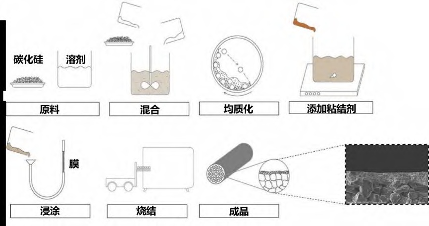 碳化硅陶瓷膜一般為非對稱結構,由支撐體、過渡層、分離層組成。其制備過程主要包括坯體成型(支撐體成型、膜層成型)和燒結,二者對于成膜性能有較大的影響,通過改變制膜參數可有效調控碳化硅陶瓷膜性能,如孔隙率、通量、機械強度等。此外,合適的制備過程決定陶瓷膜的完整性,可防止裂紋、大孔等缺陷的形成。