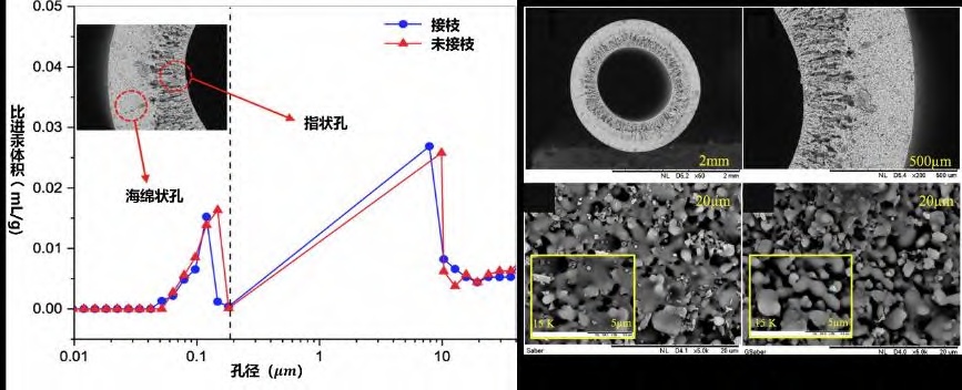 表面改性前后碳化硅中空纖維膜的孔徑分布和 SEM 圖像