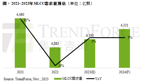 中國粉體網訊 據TrendForce集邦咨詢表示,2023~2024年MLCC市場需求進入低速成長期,產業成長空間有限,2023全年MLCC需求量預估約41,930億顆,年增率僅約3%,主要應用市場是智能手機、車用、PC等。由于全球經濟環境充滿變量,OEM及ODM均保守看待市況,預估2024年MLCC需求量將微幅上升3%,約43,310億顆。