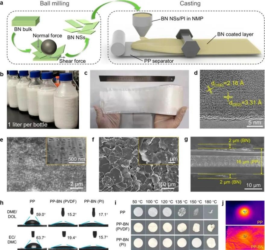 氮化硼是一種無毒、耐高溫、耐腐蝕、高導熱、高絕緣,性能優良的陶瓷材料。清華大學深圳國際研究生院周光敏副教授、丘陵副教授等人使用了一種簡單的方法,即將大規模制備的超薄六方氮化硼 (h-BN)/聚酰亞胺 (PI) 層涂覆在商用聚丙烯 (PP)隔膜上以實現低成本誘導穩定的SEI形成。