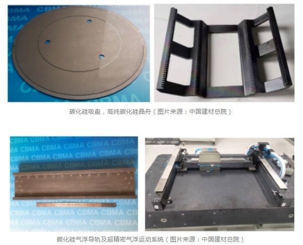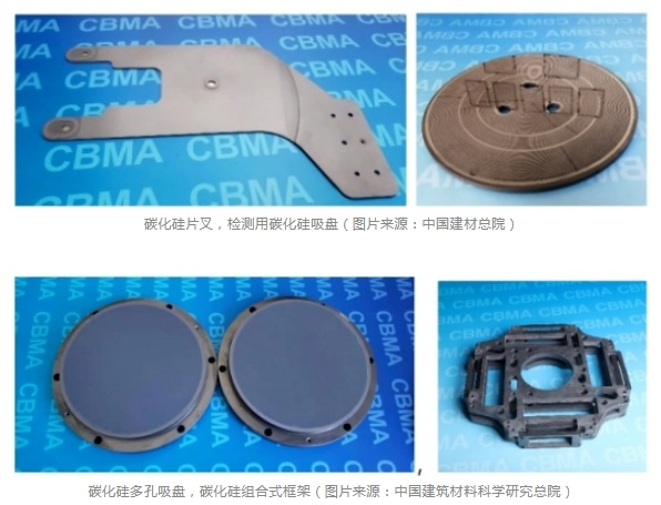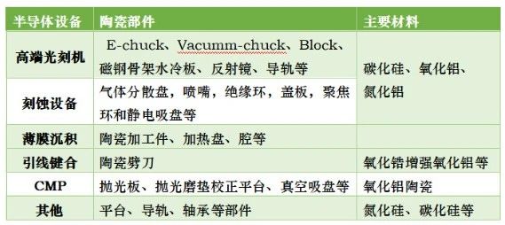陶瓷是刻蝕機、涂膠顯影機、光刻機、離子注入機等半導體關鍵設備中的關鍵部件材料,其成本已占半導體設備成本10%以上。其中,碳化硅陶瓷在半導體制造的前段到后段工藝裝備中都有廣泛應用,例如在研磨拋光吸盤、光刻吸盤、檢測吸盤、精密運動平臺、刻蝕環節的高純碳化硅部件、封裝檢測環節中精密運動系統等等,地位極其重要。