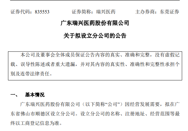 瑞興醫藥在公告中表示,公司本次設立分公司是為了適應公司發展戰略需要,優化公司戰略布局,使公司持續穩定發展,進一步提高公司綜合競爭能力及盈利能力。