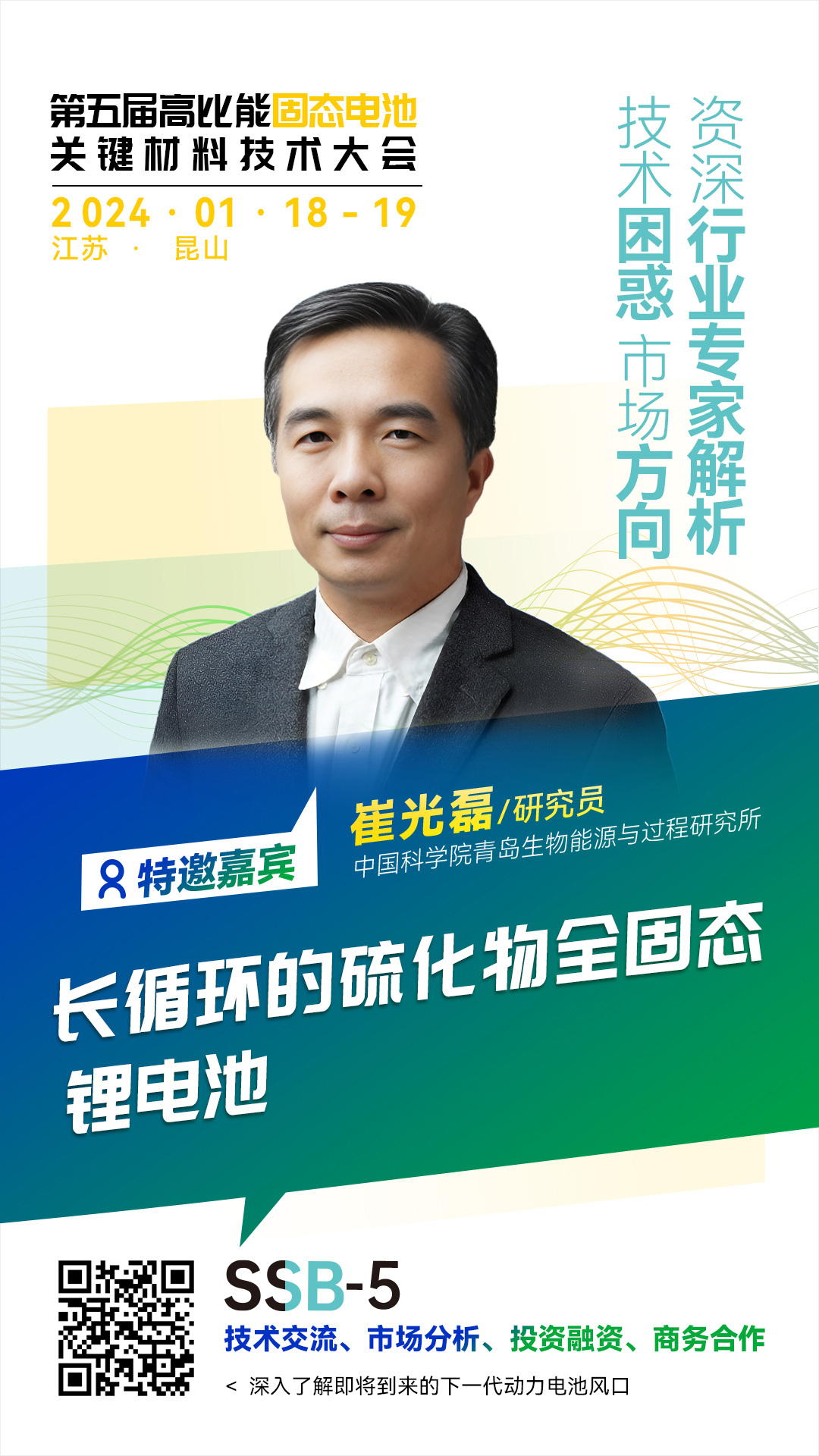 針對固態電池相關的技術、材料、市場及產業等方面的問題,中國粉體網將在昆山舉辦第五屆高比能固態電池關鍵材料技術大會。為致力于固態電池技術開發的企業,科研院校,以及電動車、儲能、特種應用等終端企業提供信息交流的平臺,開展產、學、研合作,共同推動行業發展。屆時,中國科學院青島生物能源與過程研究所研究員崔光磊將作題為《長循環的硫化物全固態鋰電池》的報告。