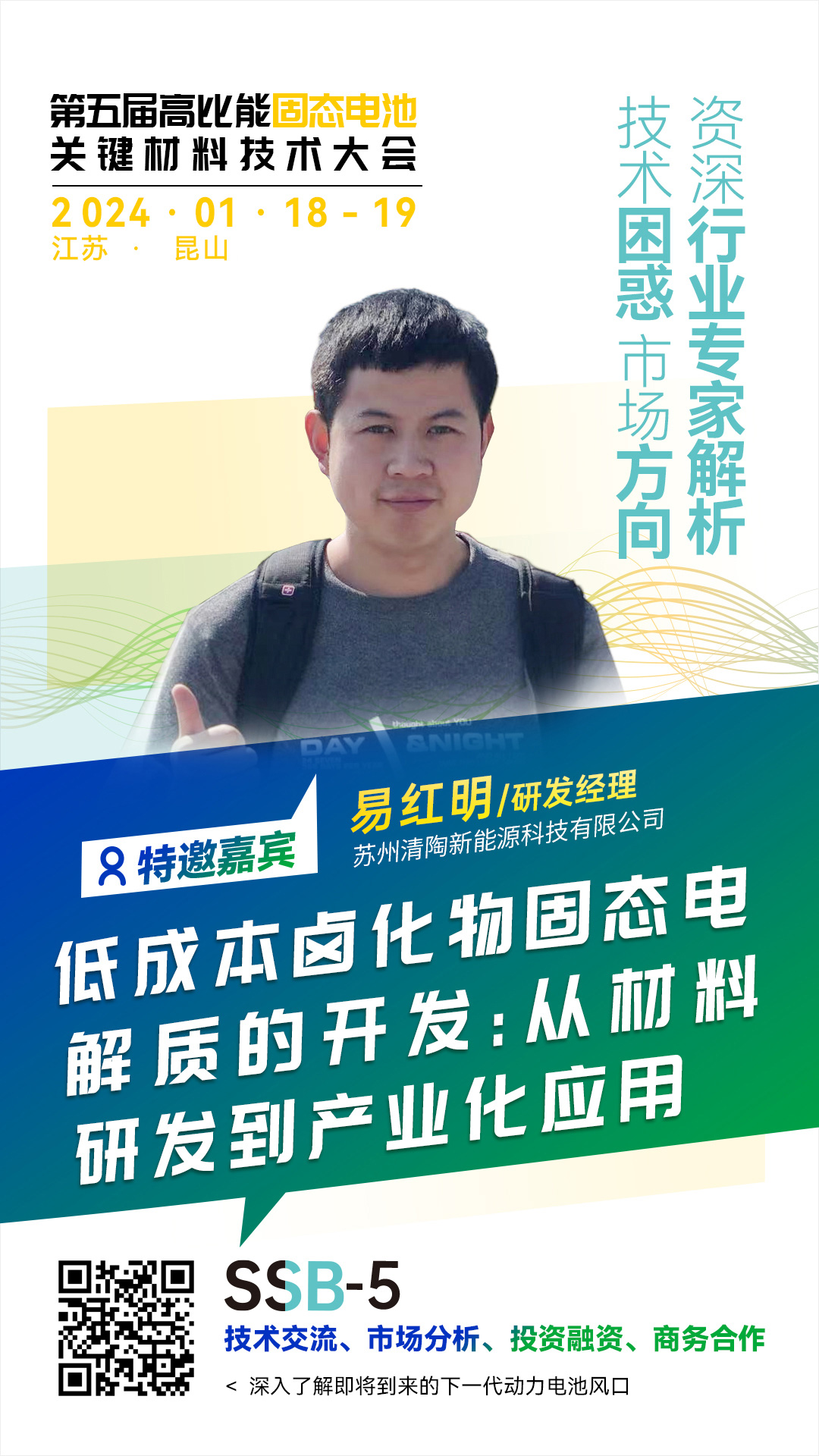 針對固態電池相關的技術、材料、市場及產業等方面的問題,中國粉體網將在昆山舉辦第五屆高比能固態電池關鍵材料技術大會。為致力于固態電池技術開發的企業,科研院校,以及電動車、儲能、特種應用等終端企業提供信息交流的平臺,開展產、學、研合作,共同推動行業發展。屆時,蘇州清陶新能源科技有限公司研發經理易紅明將作題為《低成本鹵化物固態電解質的開發:從材料研發到產業化應用》的報告。