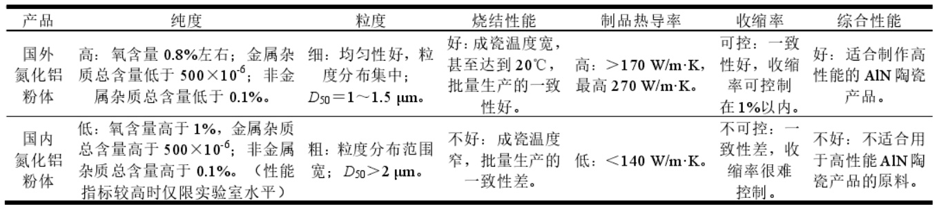 AlN粉體主要性能對比