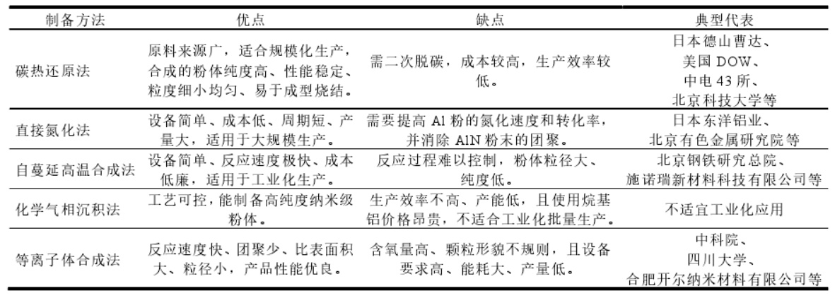 AlN粉體的主要制備方法和特點