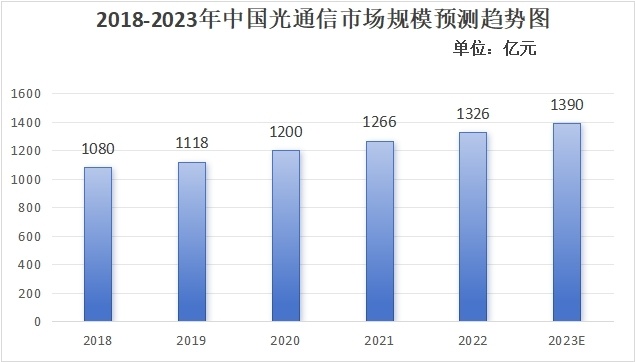 隨著光芯片、光器件的技術進步、成本下降,光通信行業將能夠更好地應對未來海量數據以及高速運算要求帶來的巨大壓力,光通信行業有望保持持續增長,2021年我國光通信市場規模達1266億元,同比增長5.5%。2022年市場規模約為1326億元,預計2023年將達1390億元。