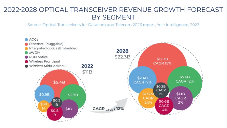 光模塊市場規模的增長也推動著作為關鍵部件之一的光模塊外殼需求的增長。據Yole數據統計,2022年全球光模塊的市場規模約110億美元,同比增長9.09%。Light counting預計,未來5年全球光模塊市場規模將的復合年增長率為11%,預測2027年全球光模塊市場將突破200億。Yole預計2022年-2028年的復合年增長率為12%,預測2028年將達到223億美元。