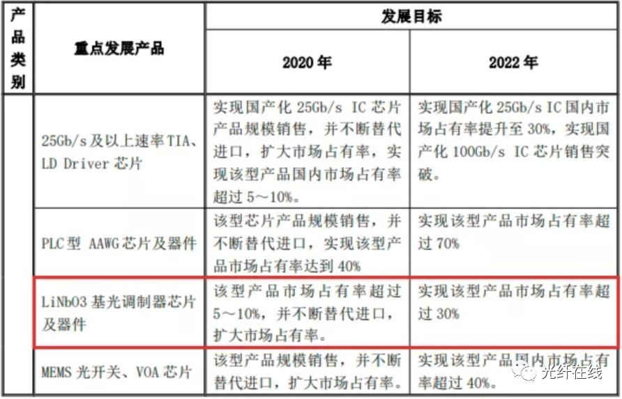 根據中國電子元件行業協會《中國光電子器件產業技術發展路線圖(2018-2022 年)》指出,目前國內核心的光通信芯片及器件仍然嚴重依賴進口,高端光通信芯片與器件的國產化率不超過10%,要求力爭在2020年實現鈮酸鋰調制器芯片及器件市場占有率超過5%-10%,并不斷替代進口,擴大市場占有率,并于2022年實現市場占有率超過30%。