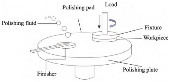 化學(xué)機(jī)械拋光(CMP)作為目前半導(dǎo)體行業(yè)使用最廣泛的全局平坦化技術(shù)。其工藝裝置主要由旋轉(zhuǎn)拋光盤、試件裝夾器及拋光液輸送裝置三部分構(gòu)成。拋光盤上粘貼有拋光墊并自旋轉(zhuǎn),外部通過(guò)承載器給晶片施加正壓力,使得晶片與拋光墊兩者之間有合適的正壓力,能夠產(chǎn)生相對(duì)運(yùn)動(dòng)。目前,氮化鋁陶瓷的CMP研究已經(jīng)取得了一系列的進(jìn)展。