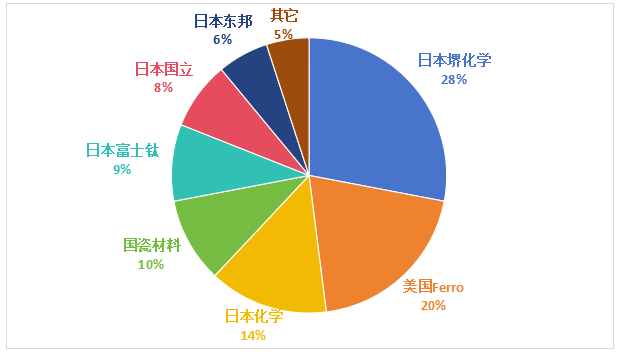 自20世紀80年代以來,日本在先進陶瓷材料科研、制備方面占有領(lǐng)先、突出的地位,在電子陶瓷、光導纖維、高韌性陶瓷等先進陶瓷材料方面,日本均處于領(lǐng)先地位。日本生產(chǎn)的先進陶瓷敏感元件已占據(jù)國際市場主要份額,包括熱敏、壓敏、磁敏、氣敏、光敏等在內(nèi)的各種先進陶瓷產(chǎn)品壟斷著大部分市場;在泡沫陶瓷、超塑性陶瓷、塑膠復合陶瓷以及各種先進陶瓷材料與陶瓷部件研發(fā),高性能陶瓷電池、陶瓷發(fā)動機等研發(fā)開發(fā)方面,也均處于領(lǐng)先地位。隨著多年來在先進陶瓷領(lǐng)域的技術(shù)積累,日本誕生了一大批在行業(yè)內(nèi)擁有重要話語權(quán)的大型陶瓷企業(yè),例如日本京瓷、村田、東芝、日本特殊陶業(yè)、NGK、昭和電工等等,特別是日本京瓷和村田等年銷售達千億級的先進陶瓷跨國公司在全球具有重要影響力。目前,日資企業(yè)在全球先進陶瓷領(lǐng)域市場份額達50%左右。