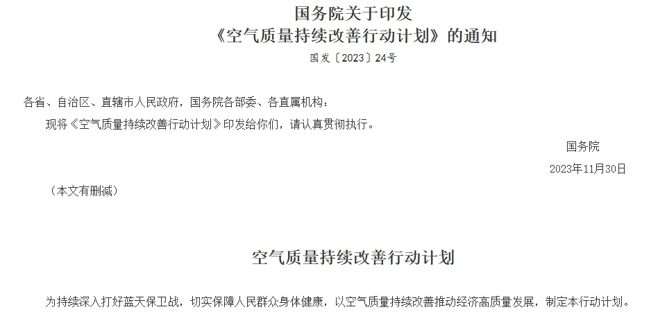 中國粉體網(wǎng)訊 11月30日,國務院印發(fā)《空氣質(zhì)量持續(xù)改善行動計劃》,要持續(xù)深入打好藍天保衛(wèi)戰(zhàn),切實保障人民群眾身體健康,以空氣質(zhì)量持續(xù)改善推動經(jīng)濟高質(zhì)量發(fā)展。據(jù)了解,這是繼2013年“大氣十條”之后的第三個國家層面的保衛(wèi)藍天行動計劃,也被網(wǎng)友稱為“新大氣十條”。