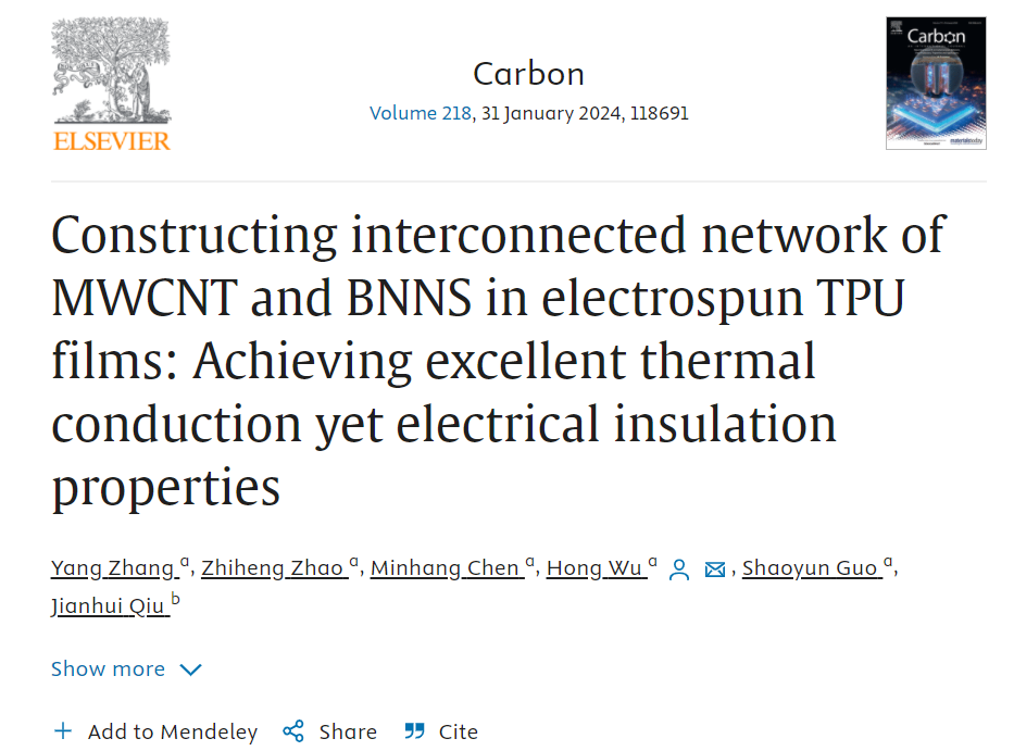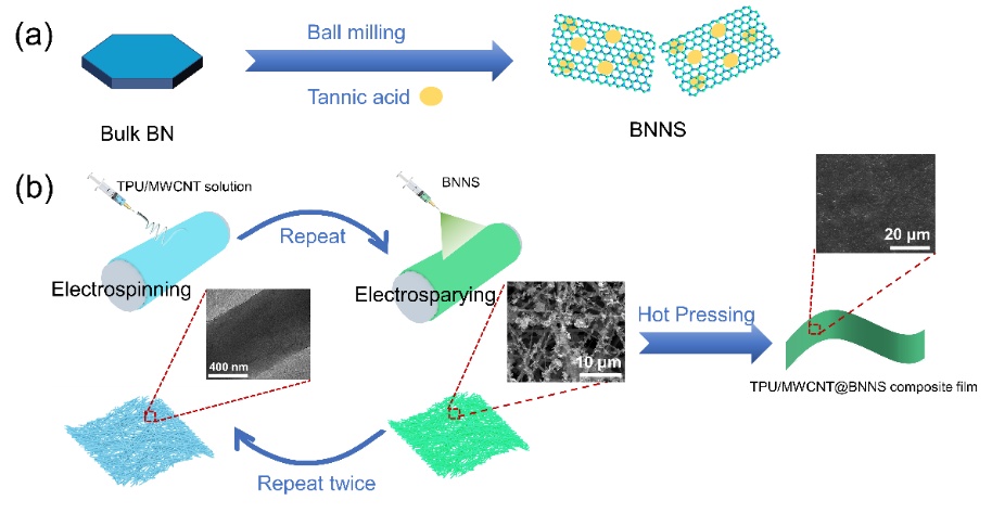 近日,四川大學吳宏教授和郭少云教授團隊在國際碳材料頂級期刊《Carbon》上,發表了最新研究成果“Constructing Interconnected Network of MWCNT and BNNS in Electrospun TPU films: Achieving Excellent Thermal Conduction Yet Electrical Insulation Properties”。研究者通過靜電紡絲、靜電噴涂和疊壓成型工藝,在熱塑性聚氨酯(TPU)復合膜中構筑了多壁碳納米管@氮化硼納米顆粒(MWCNT@BNNS)的三維互連網絡(圖1)。
