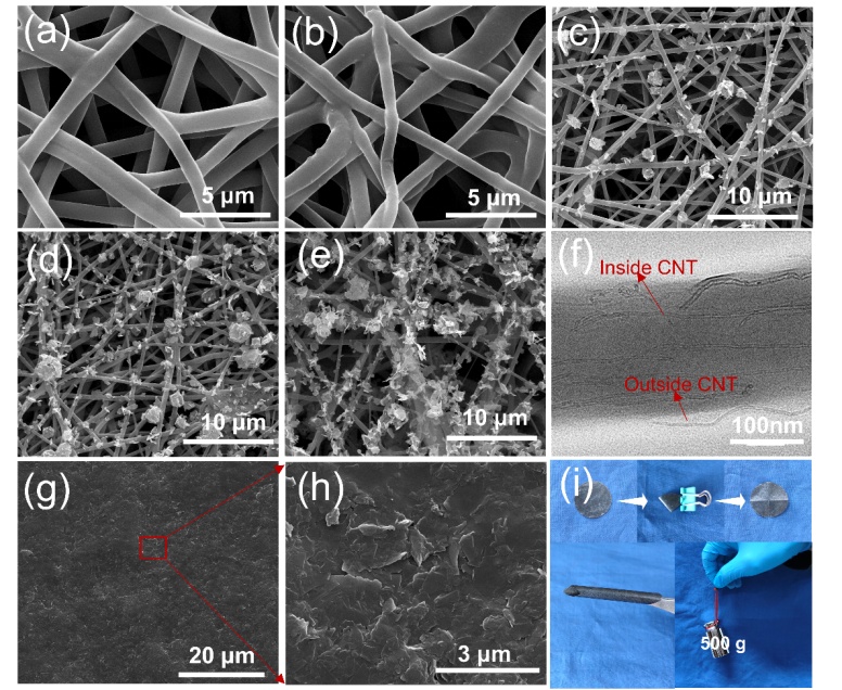 通過靜電噴涂工藝將BNNS分散液負載在TPU/5MWCNT復合纖維的三維骨架表面。從圖中可以發現,當BNNS含量為10 wt%時,TPU/5MWCNT纖維表面上的BNNS是互相分離的。隨著BNNS含量的增加,BNNS在纖維的表面緊密互連,而且它的排列就像動物的鱗片一樣重疊,形成了較為完善的導熱網絡。此外,經過疊壓過后可以進一步增大BNNS之間的接觸面積,使得三維導熱網絡變得更加致密。從圖2i中可以看出,復合膜經過彎折后而沒有被破壞,表明復合膜具有優異的柔性。