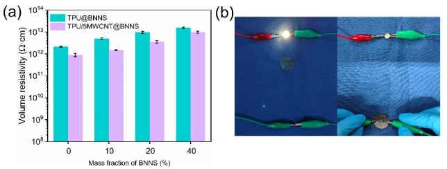 圖4a顯示了TPU@BNNS復合膜和TPU/5MWCNT@BNNS復合膜的體積電阻率。由于MWCNT是沿著TPU復合纖維的軸向方向排列并主要束縛在復合纖維內部,MWCNT的加入對TPU/5MWCNT@BNNS復合膜的體積電阻率影響很小。此外,TPU@BNNS復合膜的體積電阻率高于TPU/5MWCNT@BNNS復合膜,這是因為MWCNT將不可避免地提高復合膜的導電性能。盡管如此,所有TPU復合膜的體積電阻率都大于1011 Ω·cm,這遠遠超出了絕緣材料的標準(109 Ω·cm)。此外,將TPU/5MWCNT@40BNNS復合膜集成在直流電源和LED燈泡之間時,通電后未發現LED燈泡變亮,從而直觀地證明了TPU/5MWCNT@40BNNS復合膜優異的電絕緣性能。