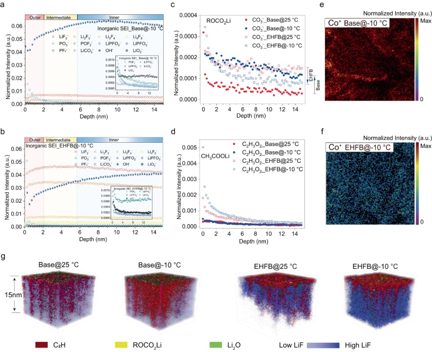 【圖5】在基礎電解質(a)和EHFB電解質(b)中,−10°C下長循環后無機SEI中官能團的深度分布。25 °C和−10 °C時基礎電解質和EHFB電解質形成的SEI中ROCO2Li組分(c)和CH3COOLi組分的深度分布 。采用基礎電解質(e)和EHFB電解質(f)的石墨負極上Co+的空間分布。g在25°C和-10°C下,采用基礎電解質和EHFB電解質的電池化成后石墨負極SEI最上面15nm的三維重建圖。