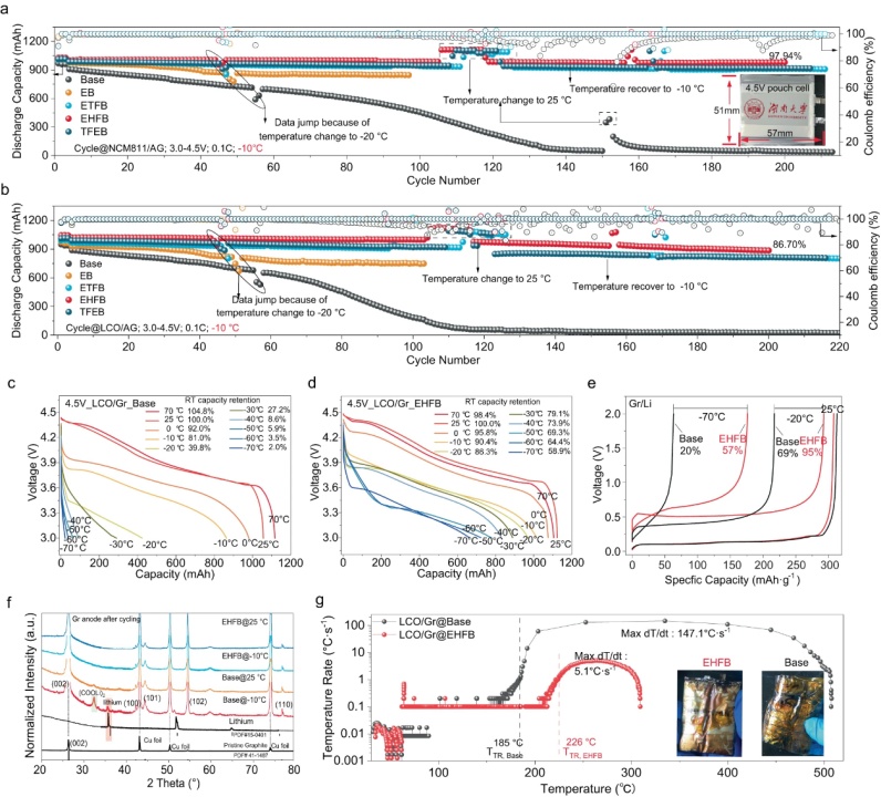 【圖6】NCM811/Gr(a)和LCO/Gr(b)電池在−10°C下不同電解質中的循環行為。具有基礎電解質(c)和EHFB電解質(d)的LCO/Gr軟包電池RT充電-LT放電的電壓曲線。e具有不同電解質的Gr/Li電池在不同溫度下的充電電壓曲線。f在−10°C和25 °C下長循環后石墨的XRD圖譜。g完全充電LCO/Gr電池的溫升速率隨溫度的變化。插圖顯示了測試后的照片。