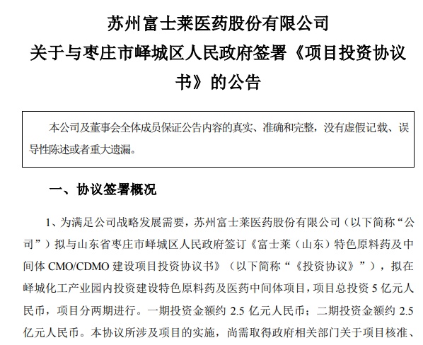 該項目的實施主體為富士萊(山東)制藥有限責任公司,總投資5億元人民幣,項目分兩期進行。一期投資金額約2.5億元人民幣,新上10條原料藥及醫(yī)藥中間體生產(chǎn)線,建設周期約30個月(自2023年12月至2026年6月);二期投資金額約2.5億元人民幣,二期項目建設根據(jù)企業(yè)規(guī)劃另行約定。