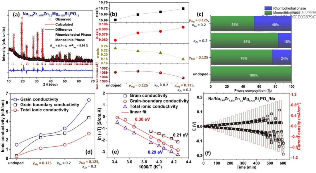 通過(guò)固態(tài)合成法成功合成了摻雜 Zn2+- 和 Mg2+ 的 Na3Zr2SiPO12。這種雙摻雜方法實(shí)現(xiàn)了較高的斜方體相分?jǐn)?shù)(46%)和較大的鈉傳導(dǎo)通道,從而提高了跨晶粒和晶界的離子電導(dǎo)率,分別為 6.3 mS/cm 和 4.4 mS/cm。經(jīng)測(cè)定,雙摻雜 NASICON 系統(tǒng)的總離子電導(dǎo)率為 2.7 mS/cm,相關(guān)遷移勢(shì)壘低至 0.29 eV,而未摻雜 NASICON 的遷移勢(shì)壘和遷移勢(shì)壘分別為 0.25 mS/cm 和 0.36 eV。